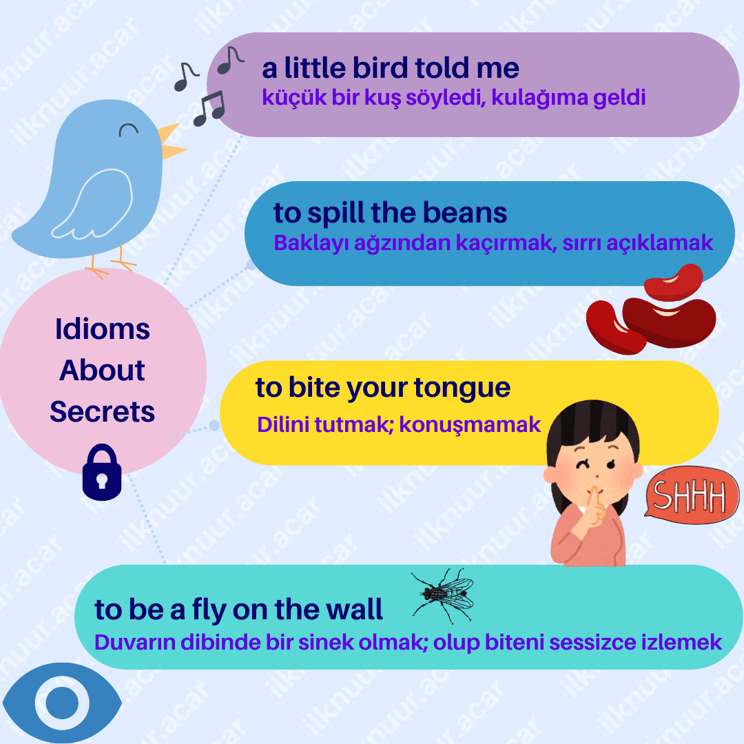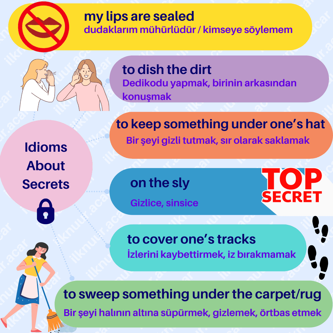 Sırlar... 👀 Herkesin küçük bir sırrı vardır, değil mi? 🤫 Peki, sırlarınızı saklarken ya da başkalarının sırlarını öğrenirken kullanabileceğiniz bazı harika deyimleri biliyor musunuz? Birinin sırrını açığa çıkarmaktan kaçınmak için “dilinizi ısırabilir 🤐” ya da duyduğunuz bir dedikoduyu “baklayı ağzınızdan kaçırarak” paylaşabilirsiniz. Bu yazıda, sırlarla dolu dünyada işinize yarayacak en eğlenceli deyimlerle tanışacaksınız. Hazırsanız, sır perdesini aralamaya başlayalım! 🗝️