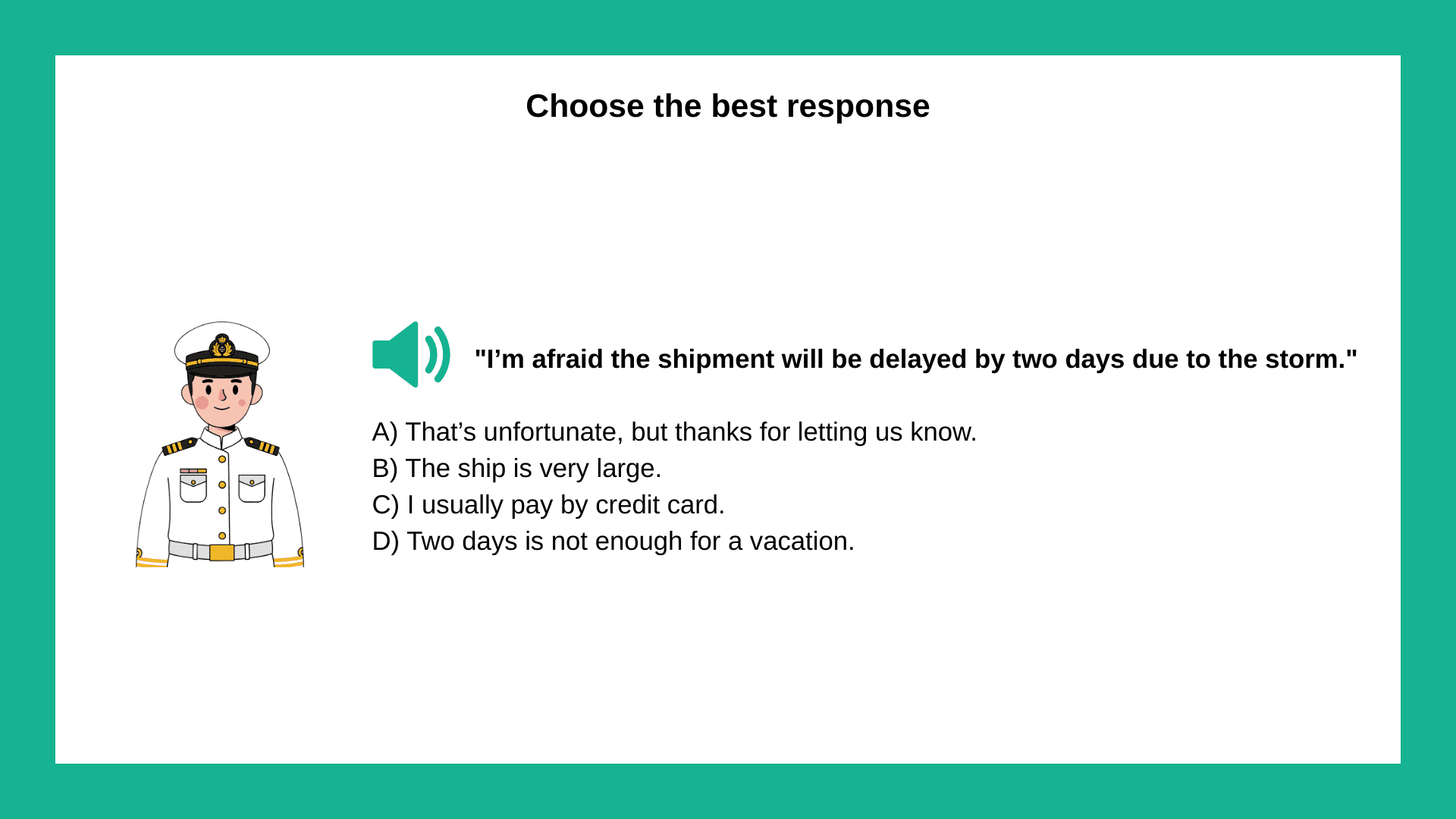 Kısa bir cümle dinle → en iyi cevabı seç (Genelde 10–15 soru)