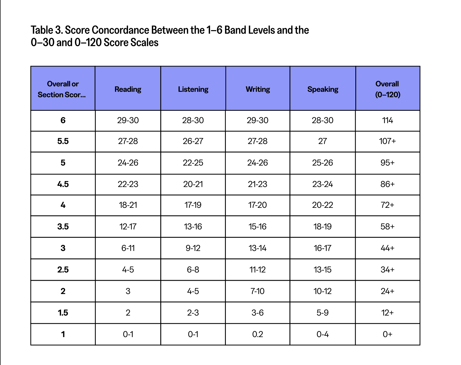 Eski TOEFL da puanlar 0 ile 120 arasındaydı. Yeni TOEFL (2026) da puanlar 1 ile 6 arası bir ölçekde.