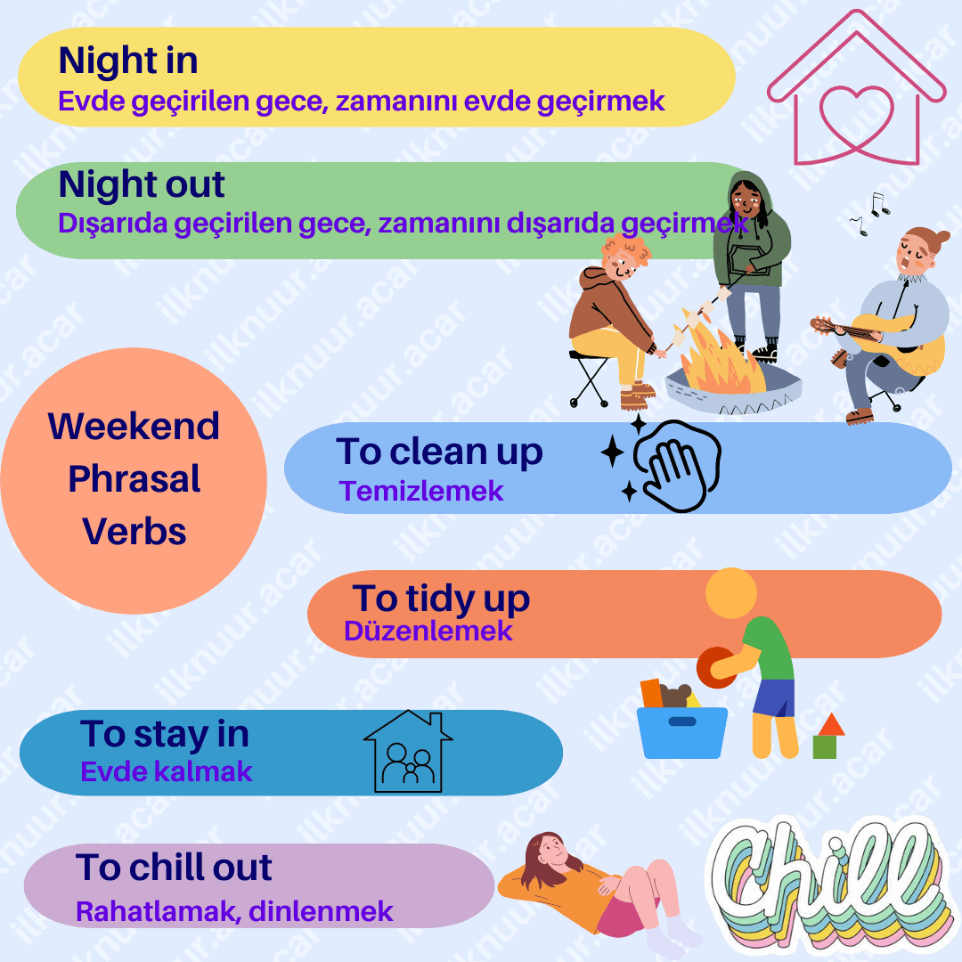 Hafta sonları, dinlenmek, eğlenmek ve yapılacak işlerden biraz olsun uzaklaşmak için harika bir zaman dilimidir. Bu süre boyunca, günlük hayatta kullandığımız pek çok ifade ve deyim de devreye girer. Özellikle hafta sonunu planlarken sıkça başvurduğumuz 'phrasal verbs' yani fiil öbekleri, İngilizce dilinde çok önemli bir yere sahiptir. 'Hang out' (takılmak), 'sleep in' (geç saatlere kadar uyumak) ve 'catch up' (birikmiş işleri veya sohbetleri tamamlamak) gibi fiil öbekleri, hafta sonunu anlatırken karşımıza çıkabilir. Hafta sonu aktivitelerini en iyi şekilde ifade etmek için kullanabileceğiniz bazı yaygın 'weekend phrasal verbs' öbeklerine göz atalım.